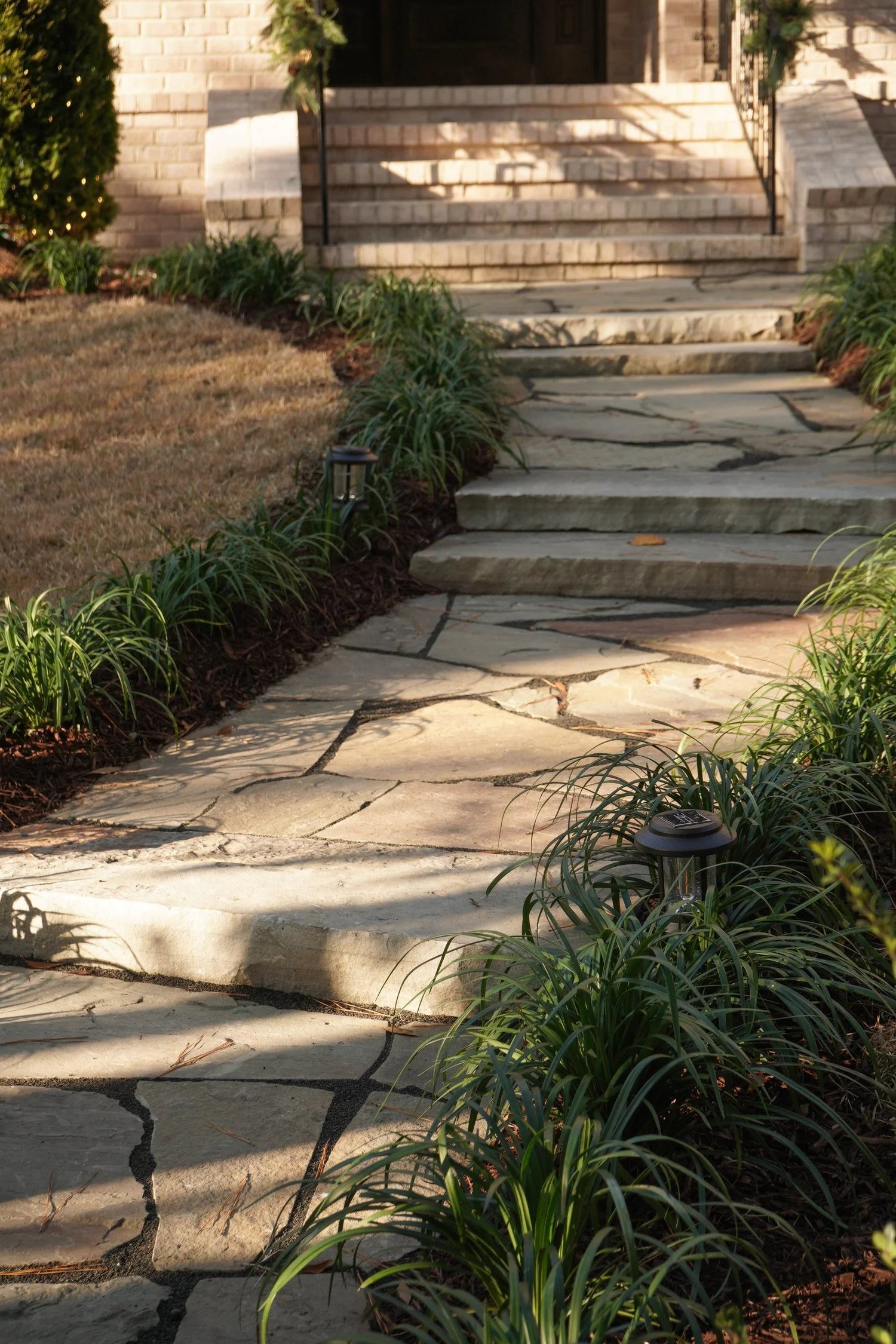 Stone Walkways & Stairs: Seamlessly connect your landscape with natural stone paths and structural masonry steps.
